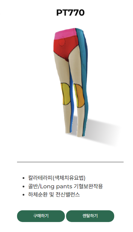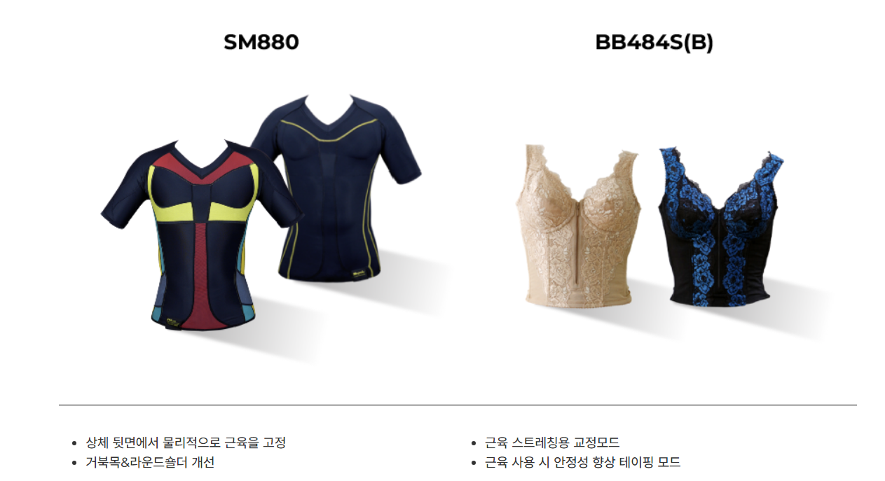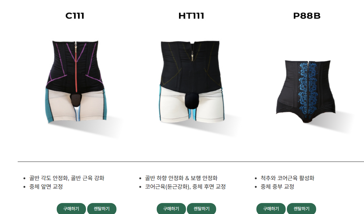 충격적인 체형 분석을 듣고 아래 그림에 있는 상체/중체/하체 옷에 대해 설명을 들었습니다. 이 제품들은 몸을 타이트하게 잡아주어서 구부정한 자세를 불편하게 만들어서 강제로 우리 몸이 쭉 펴지게 만들어지는 효과가 있다고 합니다.